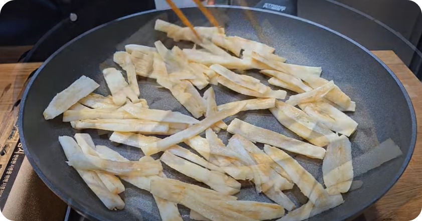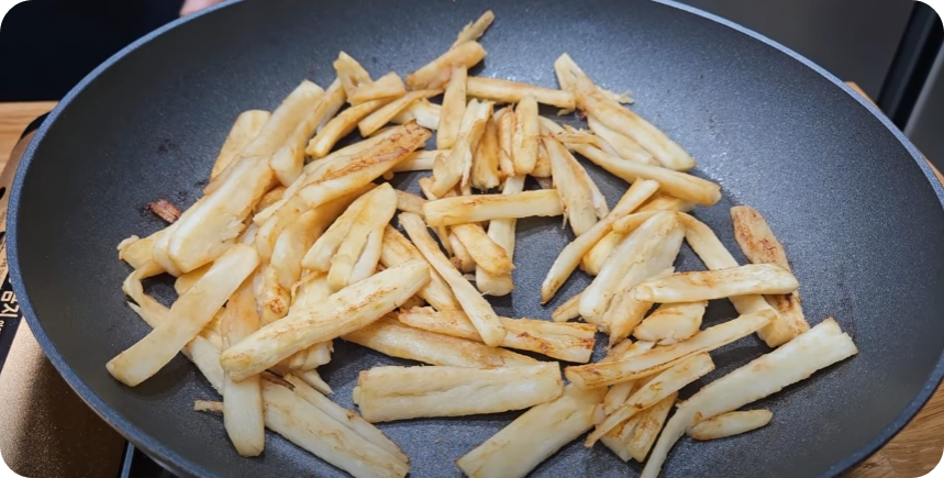 간단하게 손질이 됩니다. 마른 팬에 유장 바른 더덕을 올려 살짝 덖어수분을 날려주고 노릇노릇해지면 불을 꺼준 후