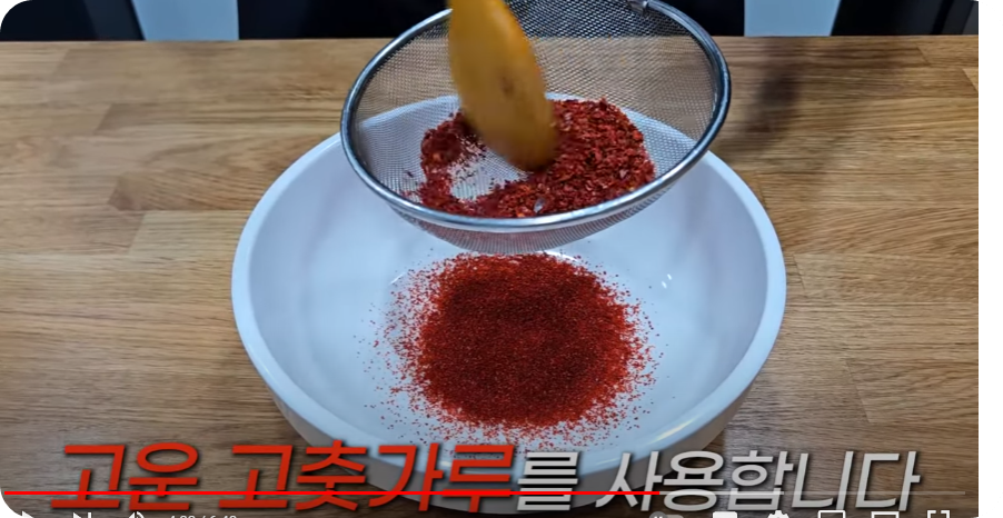 체를 받치고 고춧가루 2스푼 체에 내려 고운 고춧가루를 양념에 사용합니다. 체에 내린 고춧가루 1스푼입니다.
