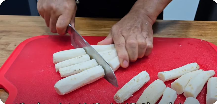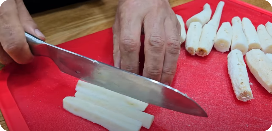 껍질 벗긴 더덕은 반을 갈라주고 두꺼운 거는 4조각 가는 더덕은 2조각을 내주세요.