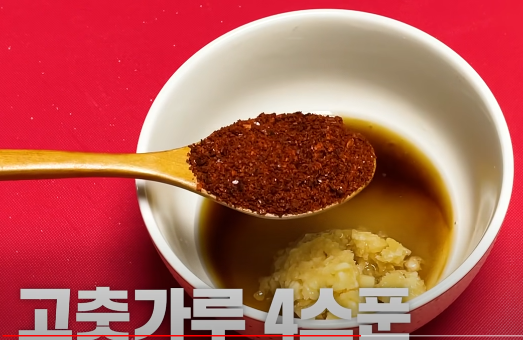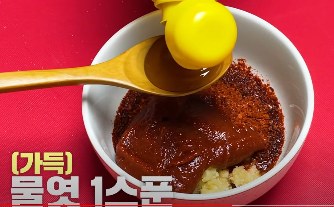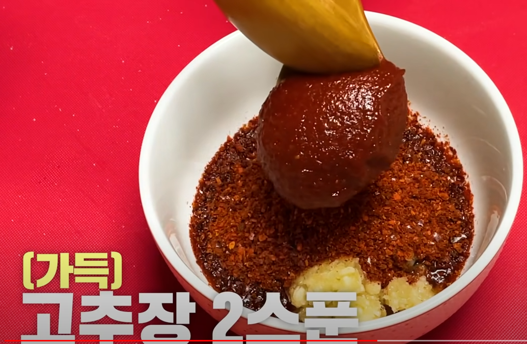 고춧가루 4스푼과 고추장 수저로 가득 2스푼을 넣어줍니다. 물엿 가득 1스푼 넣어 양념장을 골고루 섞어줍니다,.