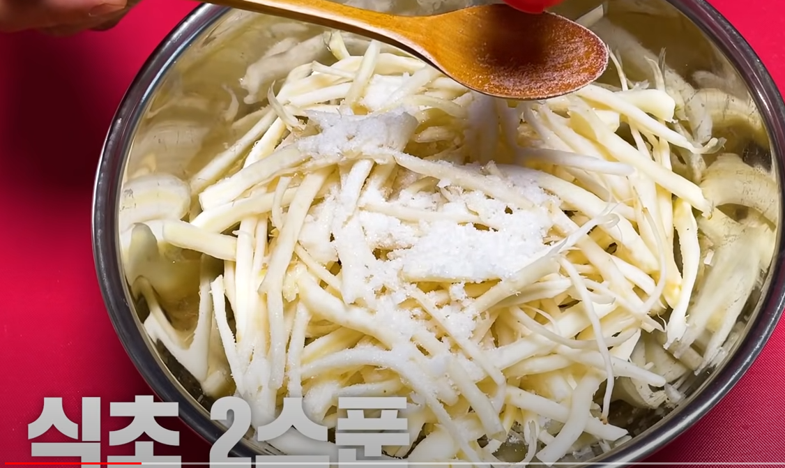 식초 2스푼, 물 2컵을 부어 쓴맛을 제거하기 위해 약 2분간 도라지를 치대어 쓴맛을 제거해 주는 과정을 거쳐 약 20분