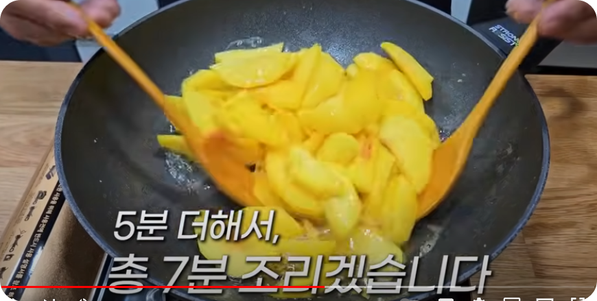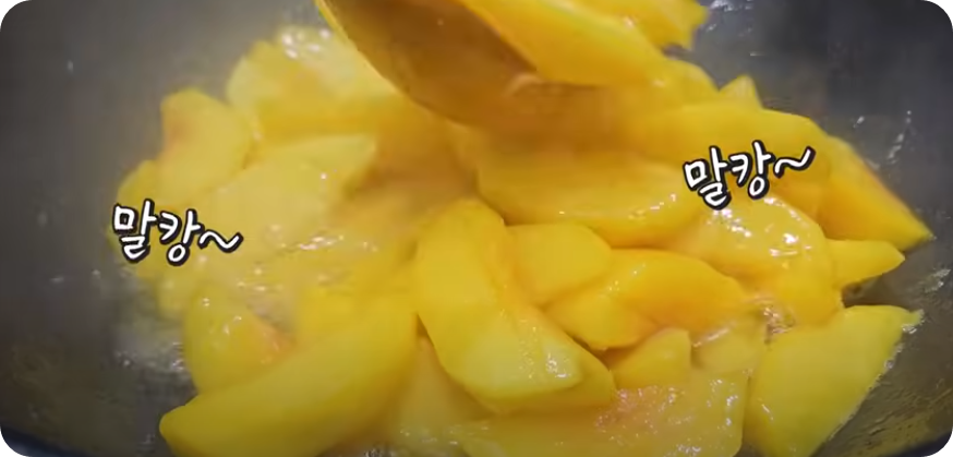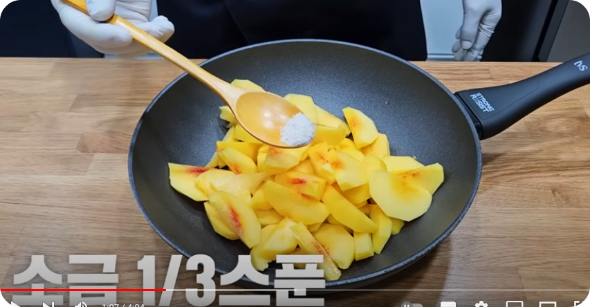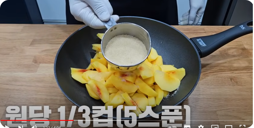 맛없는 복숭아 정말 변신해 주는 과정입니다. 복숭아 조림 총 7분이 지났습니다, 가스불을 끄고 복숭아조림을
