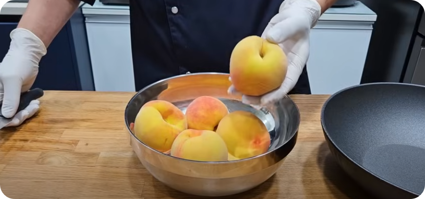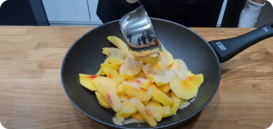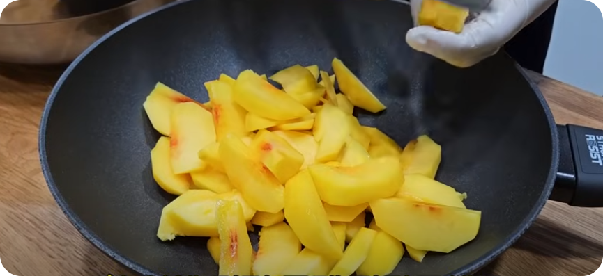 5분 재워 단맛이 배인 복숭아에 생수 반컵을 부어 강불로 조려주세요, 2분 정도 조려주면 물이 제법 많이 나오는데요,