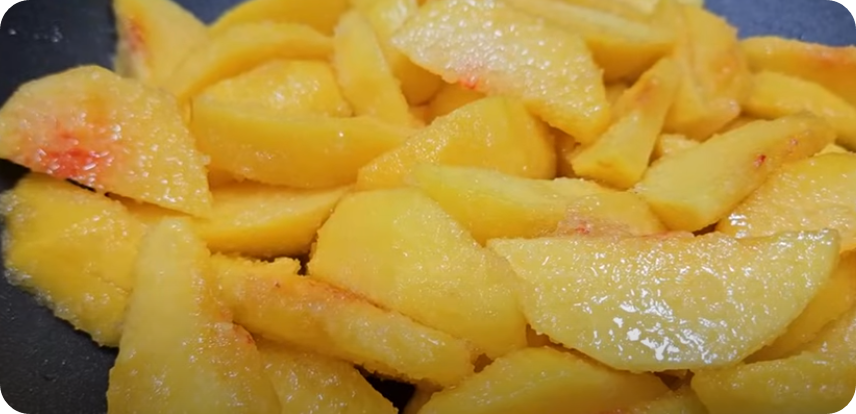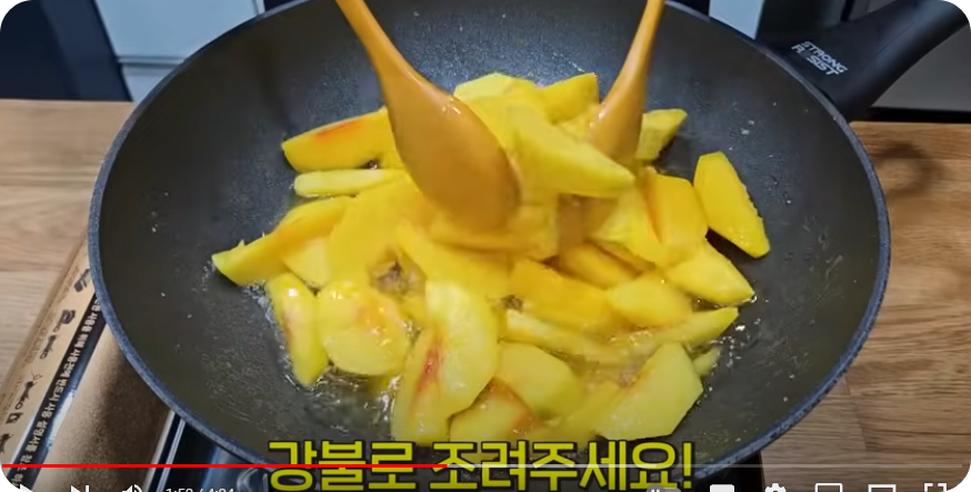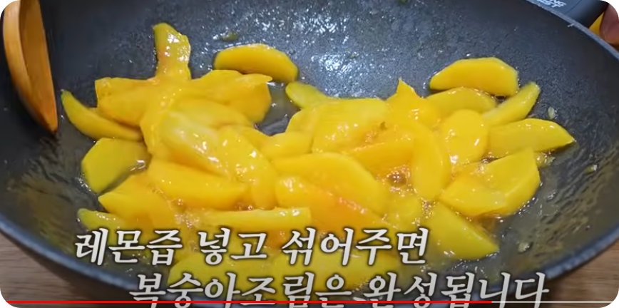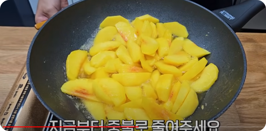 이 단계에서 불은 중불로 줄여줍니다. 지금부터 5분 더해서 총 7분 조려주면됩니다.복숭아가 말캉말캉 단맛이 어우러