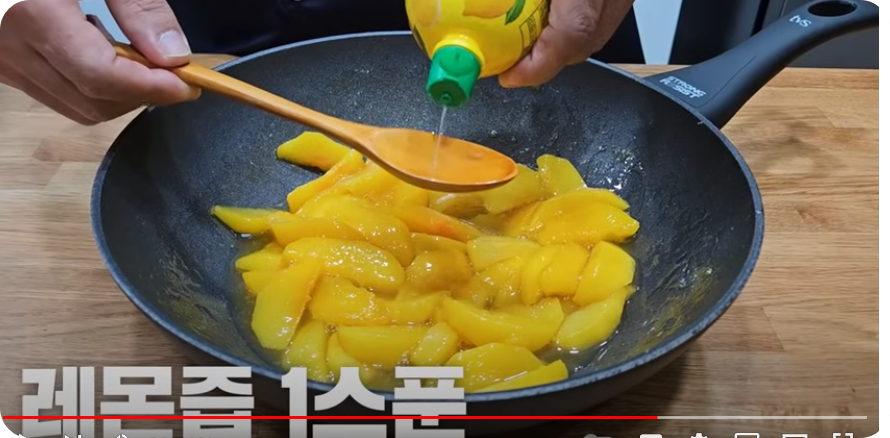 완전히 식혀주세요. 식힌 복숭아조림에 오늘 비방의 비법레시피 레몬 1스푼을 넣어 새콤함과 달콤함을 더해줍니다.