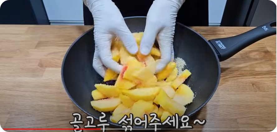 아닌 설탕을 넣을대는 4스푼 정도 넣어줍니다. 설탕 소금 넣은 복숭아는 골고루 섞어 주세요.
