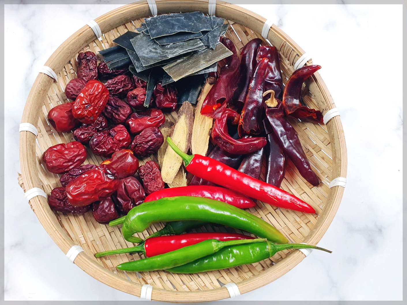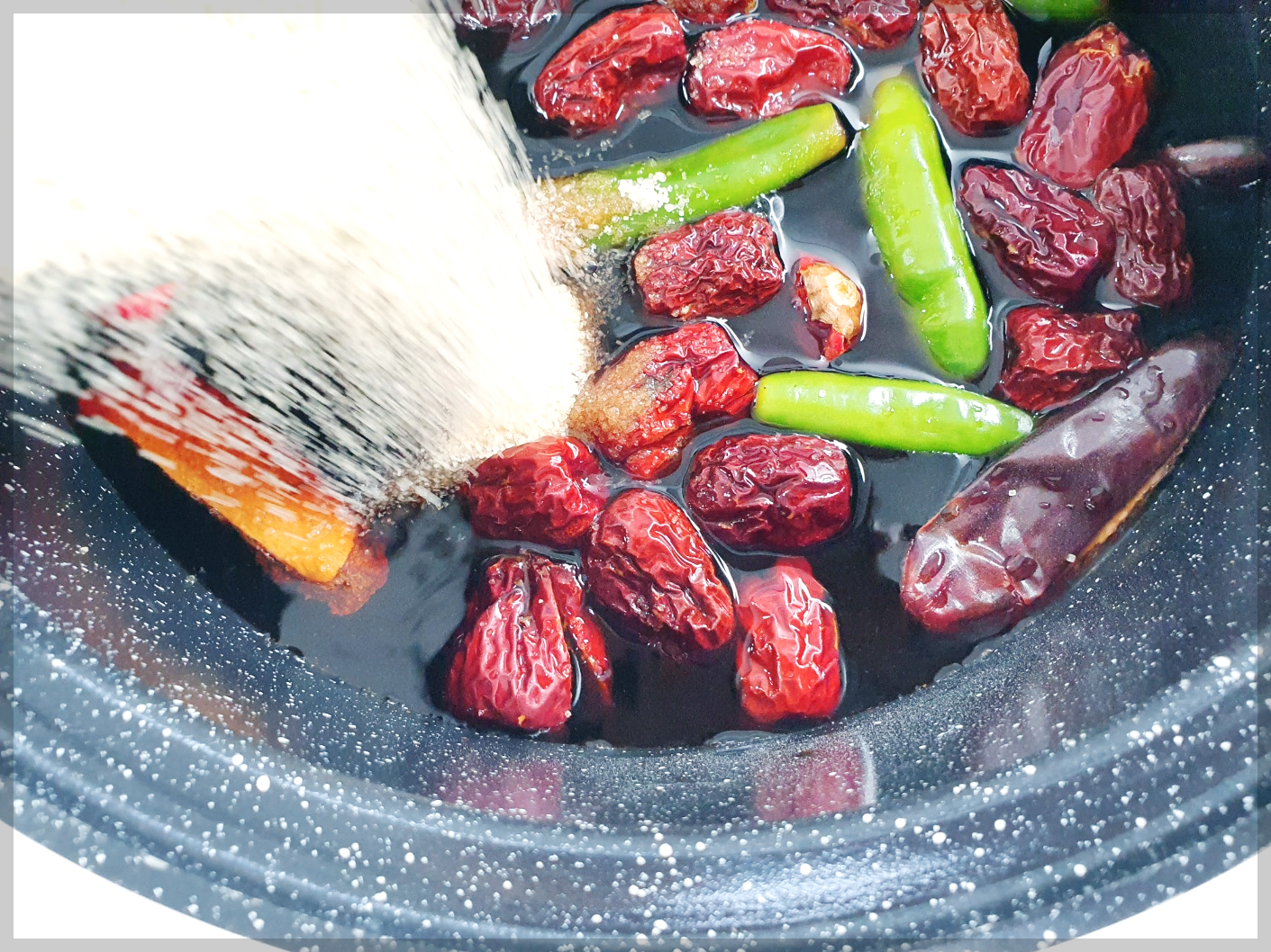 감초는 은은한 단맛을 주며 방부제 역할도 해주며 청양고추와 건고추는 칼칼한 맛을 가미해 주어 깔끔한 맛의