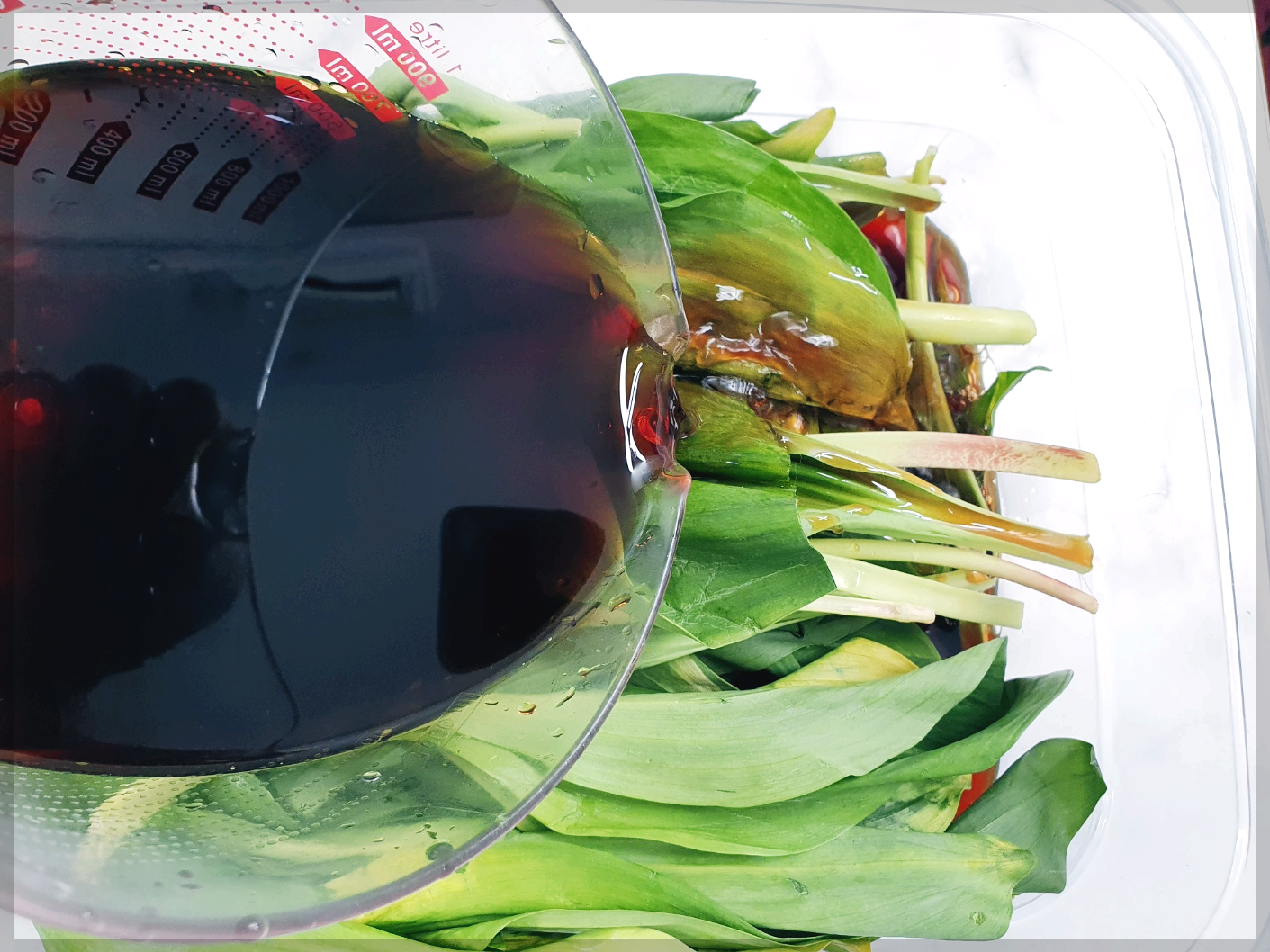 명이나물 산마늘 담은 통에 끓여 식힌 장아찌 간장물을 조심히 부어줍니다.