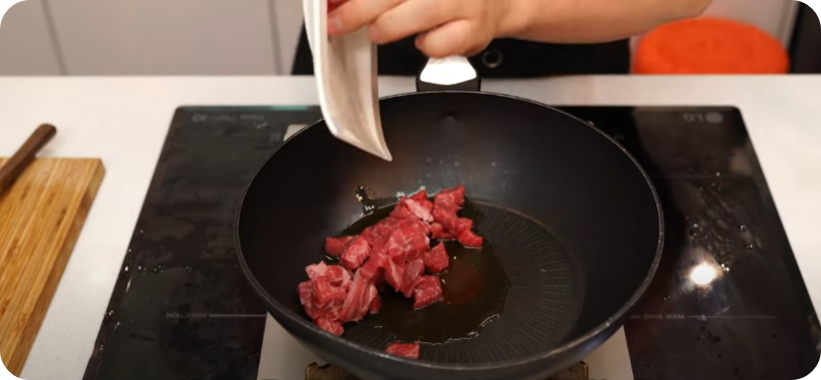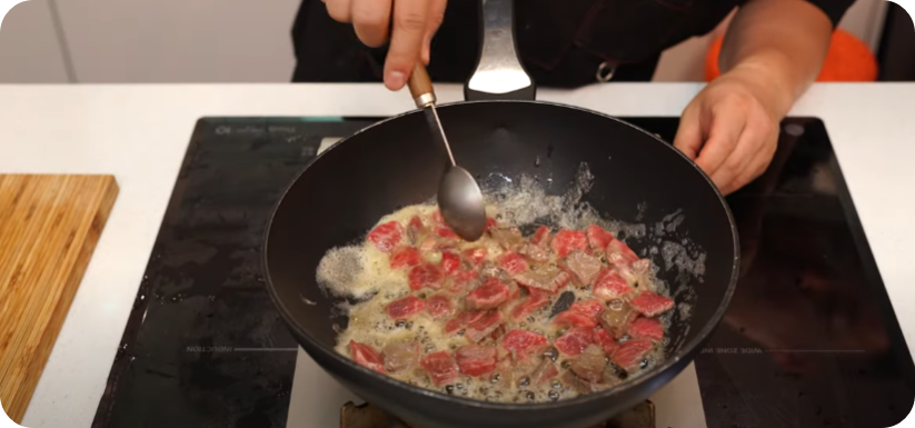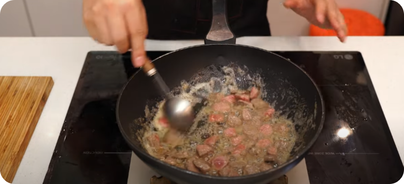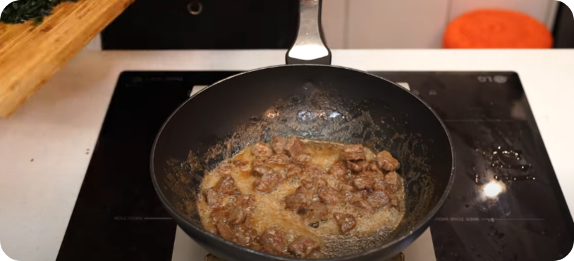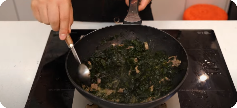 불은 중불을 유지하면서 고기를 볶아줍니다 불이세면 기름이 타서 좋지 않아요. 고기가 볶아지는 동안 불린 미역은