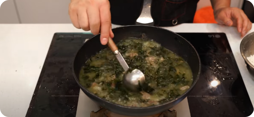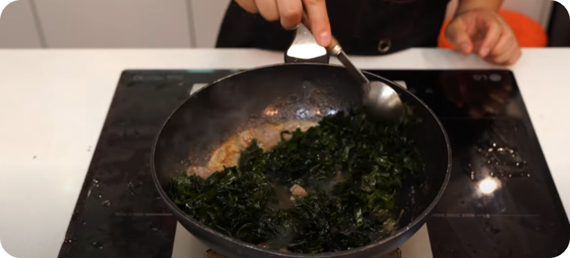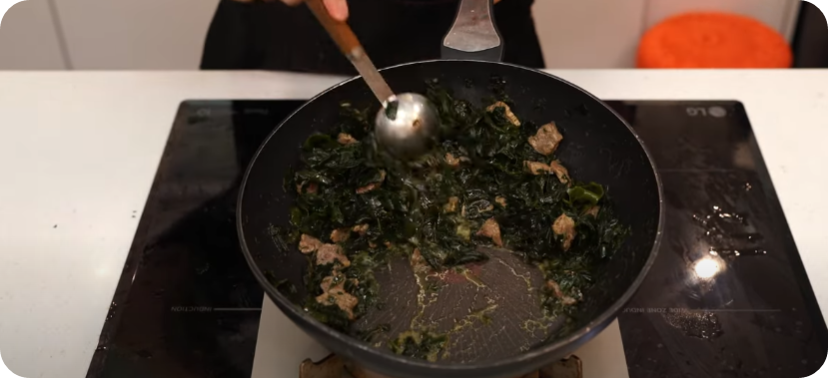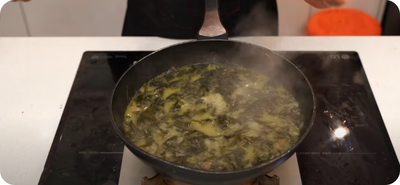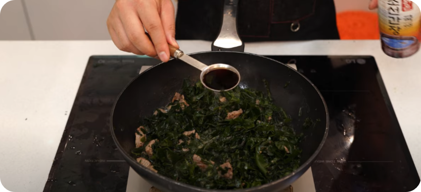 소고기와 미역을 충분하게 볶아 구수함과 진한 국물 베이스를 만들어 구수한 쌀뜨물 부어 다시 한번 끓여내면