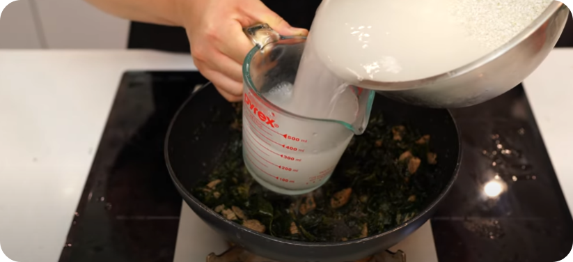 충분하게 볶아준 미력과 소고기에 쌀뜨물 1리터 또는 사골육수 1팩을 넣어줍니다. 쌀뜨물이 들어가면