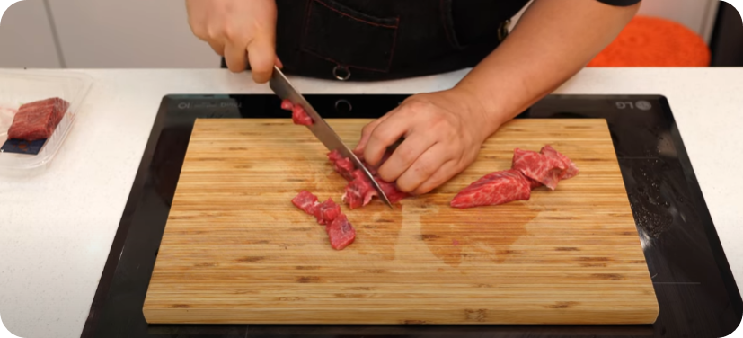 부재료 준비해 줍니다 소고기 150g 한입 크기로 썰어줍니다, 고기는 양지, 사태 등 냉장고 형편에 맞게 하시면 됩니다.
