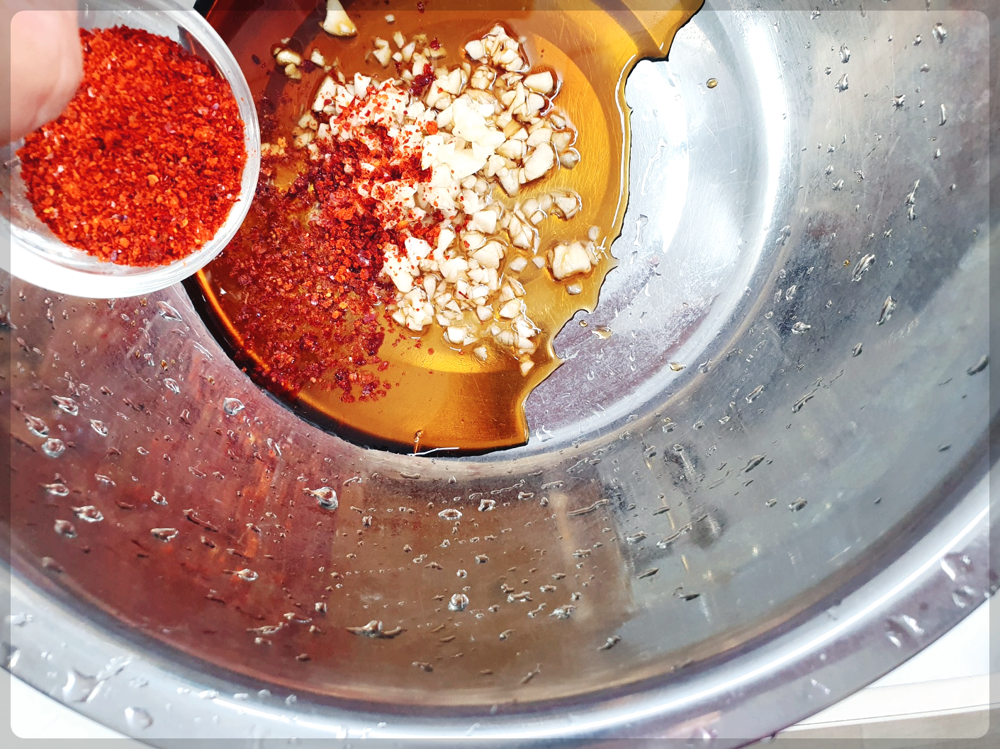 양념: 고춧가루 1큰술, 진간장 1큰술, 액젓 1큰술, 매실청 2큰술, 현미식초 2큰 술