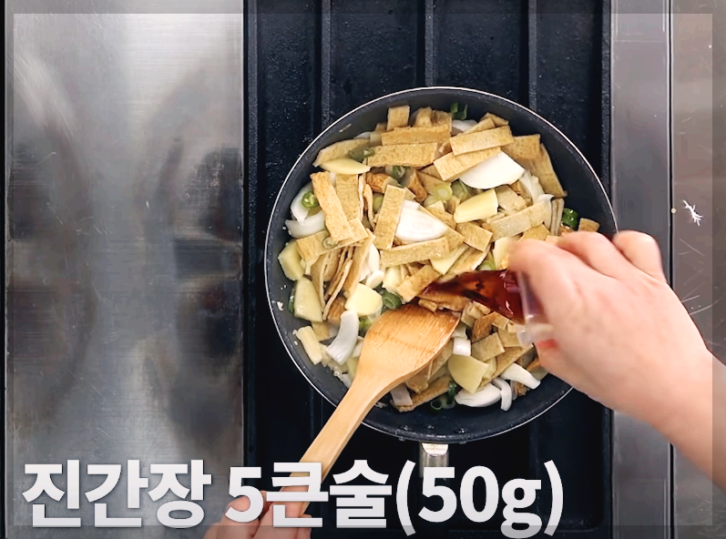 바로 양념해주면 됩니다. 타지 않게 물을 넣어 주고 진간장 5큰술과 황설탕을 넣어 골고루 양념이 섞이도록 저어줍니다.,