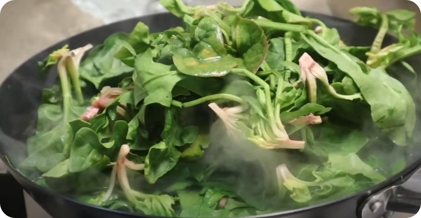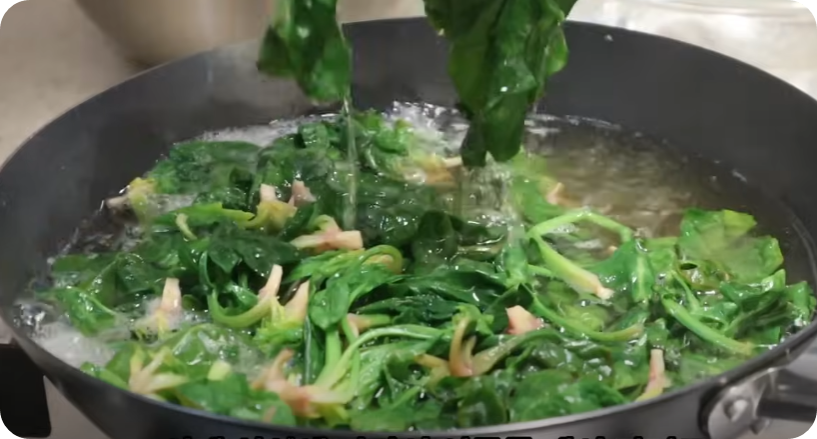 팔팔 끓는 물에 소금 약간 넣어준 후 시금치를 넣어 1분 미만으로 짧게 데쳐줍니다. 뽀글뽀글 기포가 올라오면 건져 차가운 물에 담가 열기를 식혀 체에 밭쳐 물기를 빼줍니다.