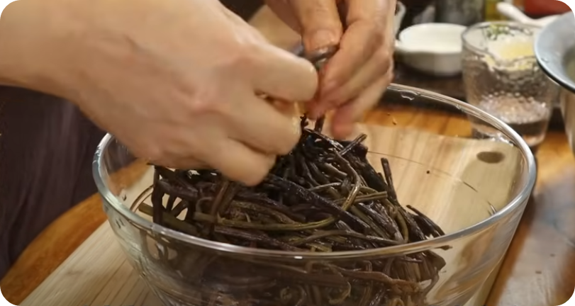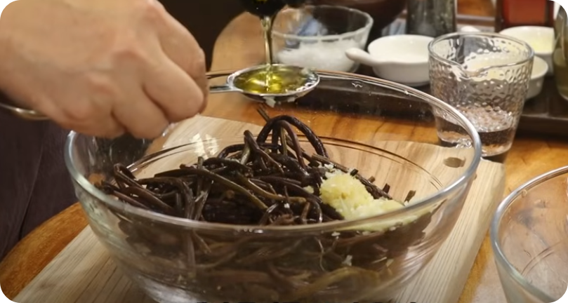 고사리나물 양념: 국간장 1큰술, 다진 파 2작은술, 다진 마늘 1작은술, 다시마육수 5~6 큰술, 깨소금 1큰술, 들기름 1큰술