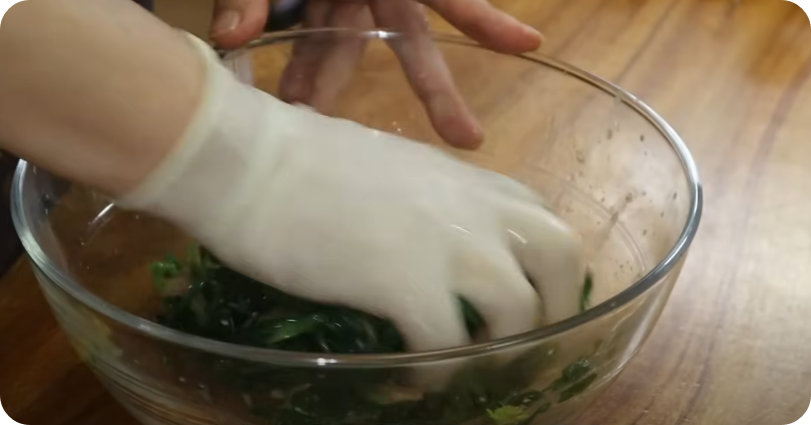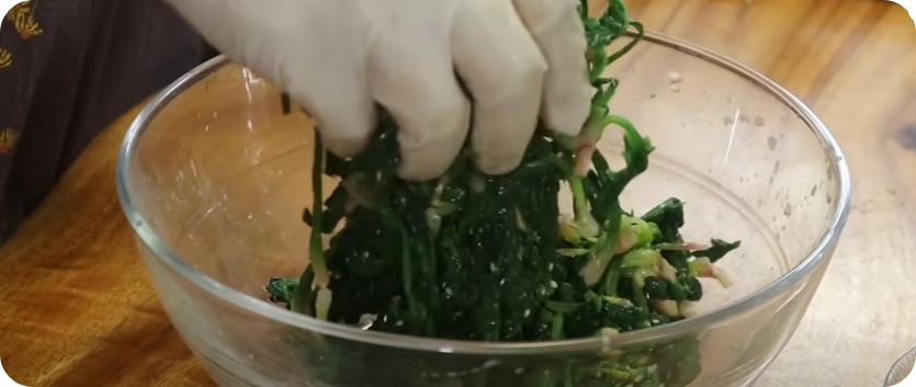 데쳐 손질한 시금치는 너무 꽉 짜지 말고 청장과 참기름 깨소금만으로 조물조물 손가락 사이로 나물즙이 올라올 때까지