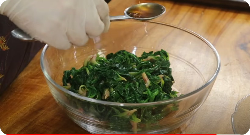 시금치나물 양념: 청장 2/3큰술, 참기름 2작은술, 깨소금 2작은술