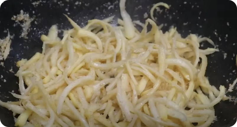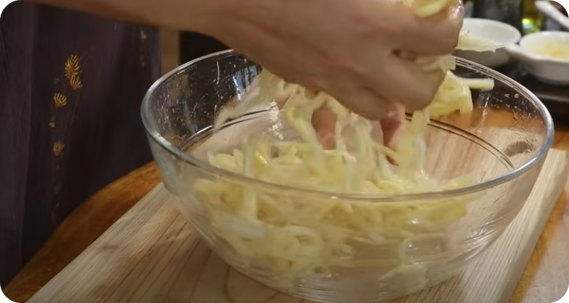 도라지는 가늘게 길지 않게 찢어 준비합니다. 도라지는 쓴맛 제거를 위해 소금 한 큰 술 넣어주고 물 약간 넣어 조물조물