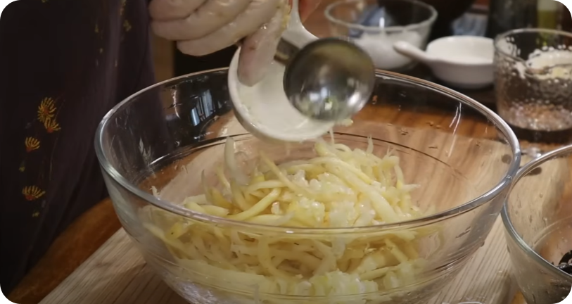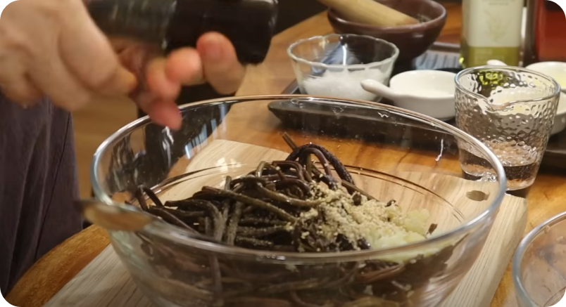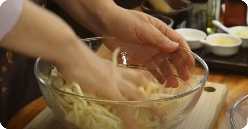 도라지나물 양념: 천일염 1큰술(절일 때), 다진 파 2작은술, 다진 마늘 1작은술, 다시마 육수 4~5큰술, 깨소금 2작은술,