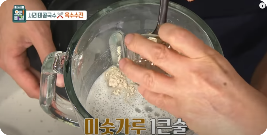 1차로 갈아준 콩국물에 미숫가루 1큰술 넣어 고소함과 영양을 더해줍니다. 다시 한번 2차로 곱게 갈아줍니다.