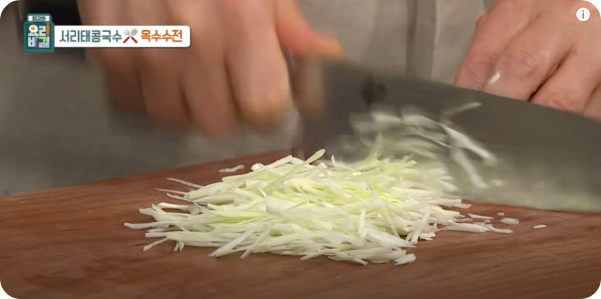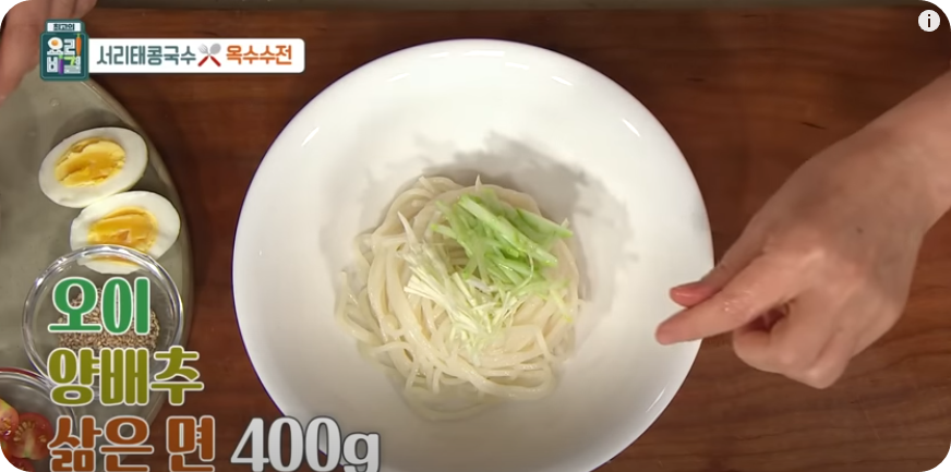 오이채와 양배추채를 곱게 채 썰어 고명을 준비해 주세요.