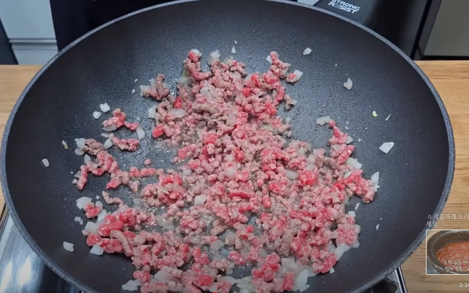 양파는 약 1분 30초 정도 볶아준 후 여기에 소고기 다짐육 160g을 넣어 불을 약불로 낮춰줍니다.