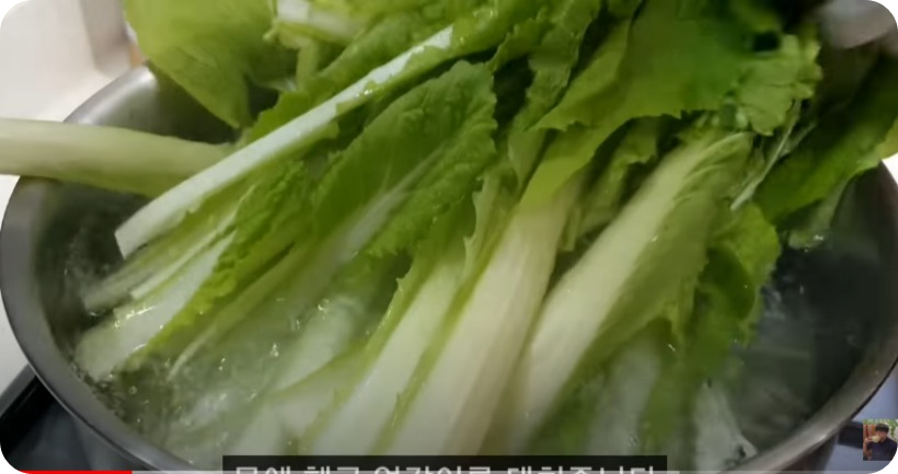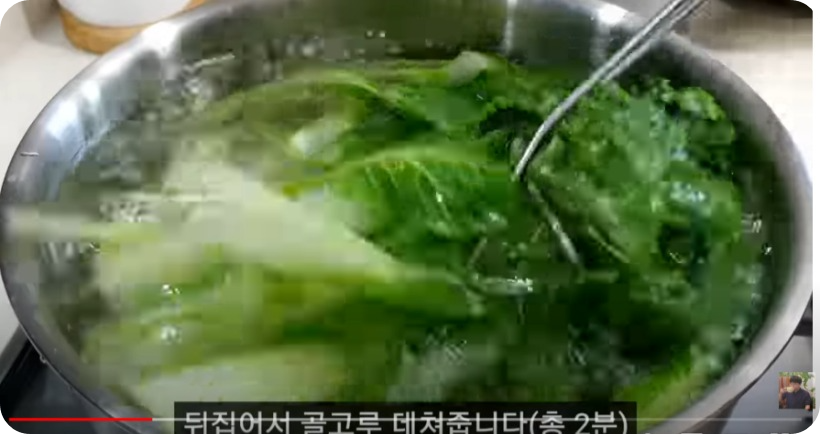 끓는 물에 굵은소금 1큰술 넣어 손질한 얼갈이를 넣어 데쳐줍니다. 뒤집어 골고루 약 2분간 데쳐주세요.