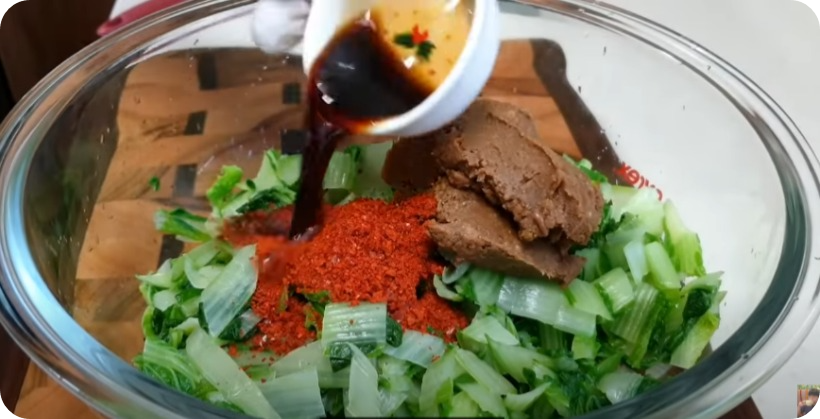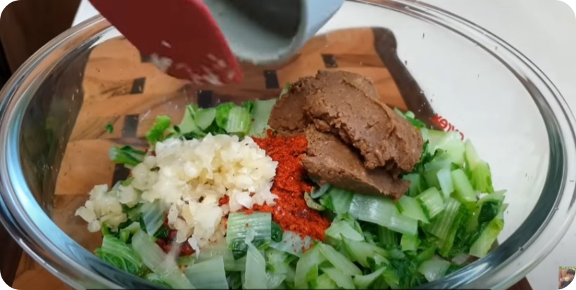 집된장(재래된장) 3.5큰술, 고춧가루 1큰술 ,국간장 1큰 술 ,다진마늘 2큰술 넣어 조물조물 무쳐줍니다.
