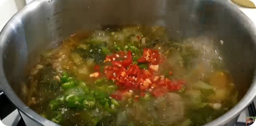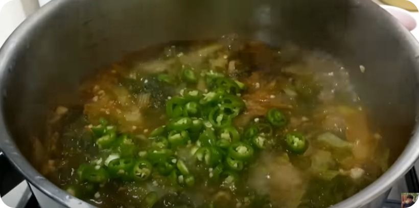 국물이 팔팔 끓어오르면 중, 약불로 낮춰주고 뚜껑을 덮어 15분간 뭉근하게 끓여줍니다. 15분 후 청, 홍고추를 넣고