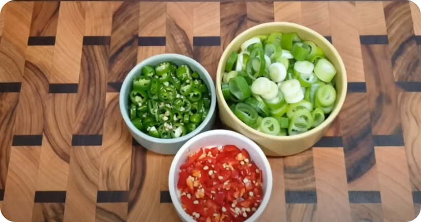 국이 끓는 동안 대파 2대 송송 썰어주고 청양고추 홍고추도 송송 썰어 준비합니다. 된장국에 칼칼한 청양고추가