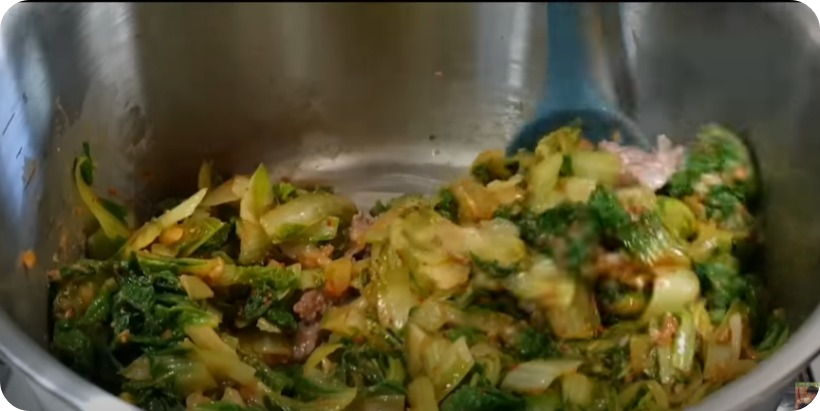 중불에서 타지 않게 골고루 잘 볶아줍니다. 볶아진 소고기에 양념한 얼갈이배추를 넣어 고기와 양념이 어우러지게