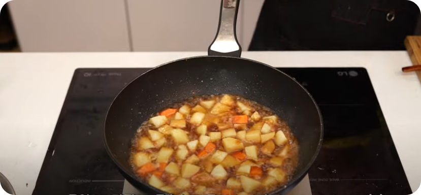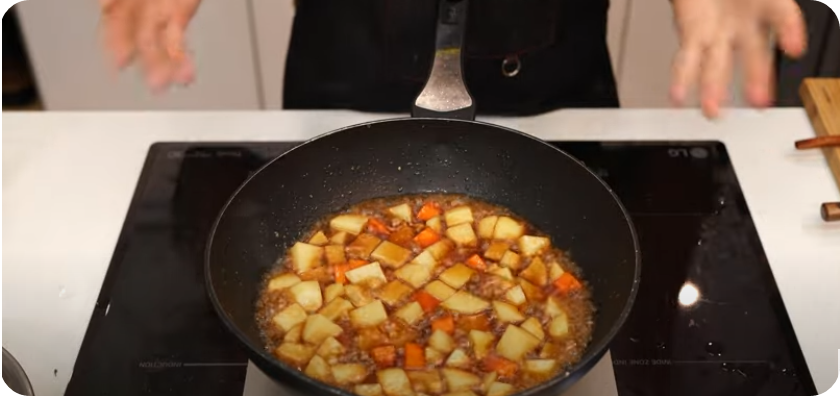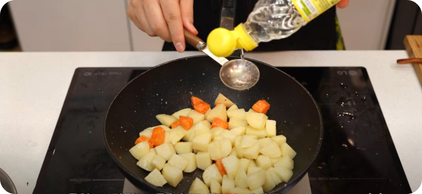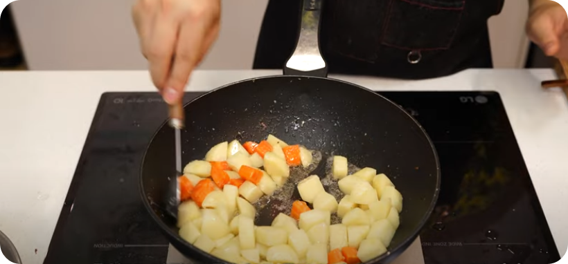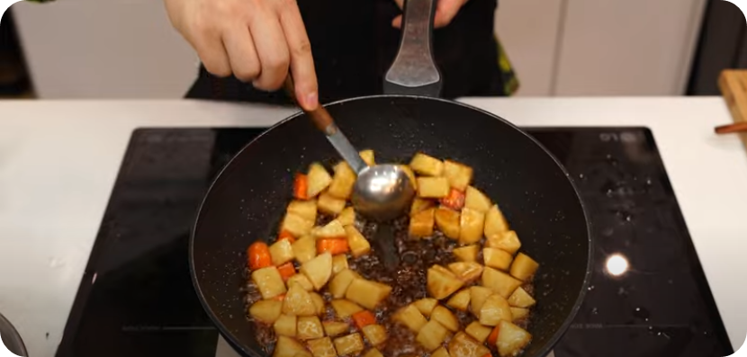 당근, 전분 뺀 감자를 넣어 감자가 살짝 익을 정도까지 볶아 줍니다.감자를 한번 볶아 조림이나 볶음을 하면 깨지거나