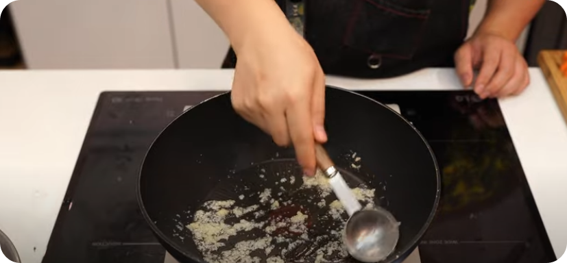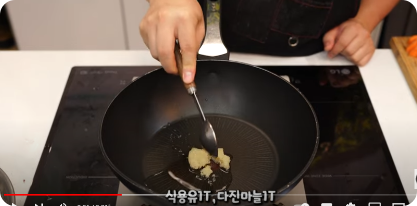 팬이나 웍에 식용유 1T과 다진 마늘 1T 넣어 마늘을 볶아 향을 내줍니다. 그대로 하는 것보다 향을 내주면 맛이