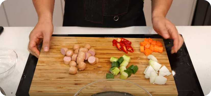 부재료 양파, 대파, 당근 소시지 10개는 감자 크기로 썰어주고 홍고추는 없으면 빼도 괜찮습니다.