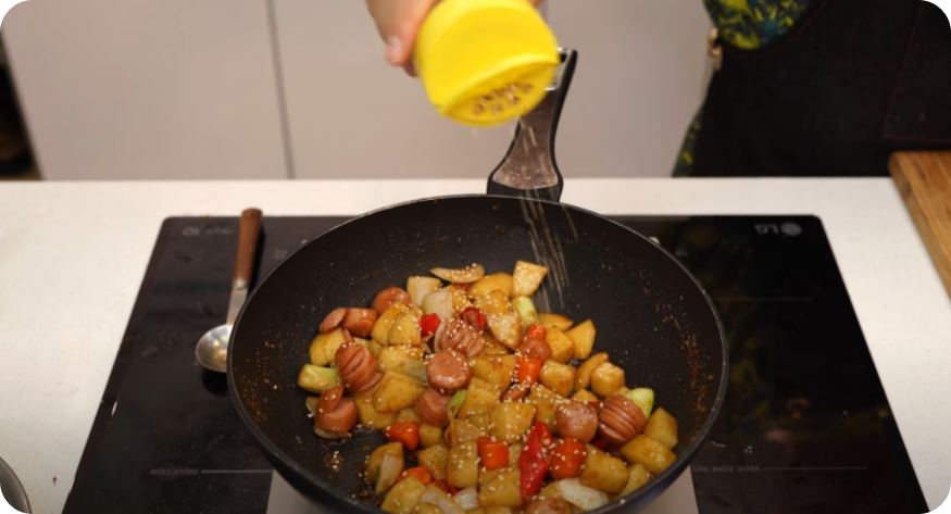 소스가 남아있을 때 골고루 잘 섞이도록 볶아주면서 잠시 기다렸다 뒤지어주고를 반복하면서 볶아주어야 감자가