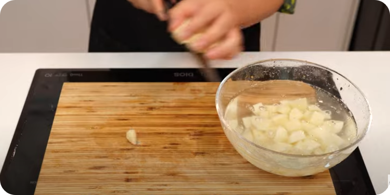 먹기에 좋은 크기로 썰어주세요. 썰은 감자는 물에 담가 전분기를 빼줍니다.