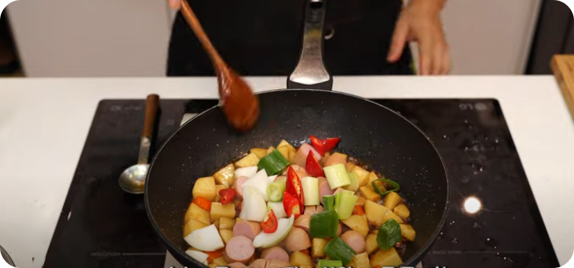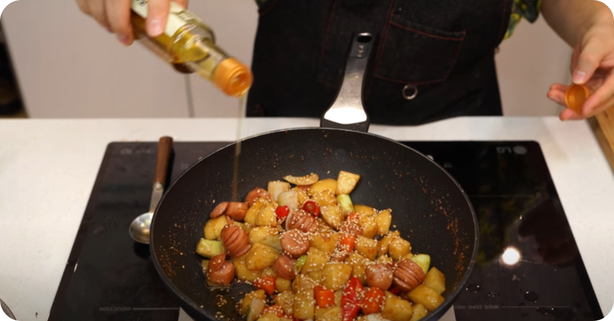 소스가 졸아서 바닥이 보이기 시작하면 준비한 부재료 소시지, 양파, 대파, 홍고추를 넣어 볶아줍니다.