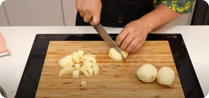 감자는 껍질 벗겨 깍둑썰기 해줍니다 아이들 먹기에 좋게 작게 썰어 준비합니다. 엄지마디정도의 크기로 아이들도