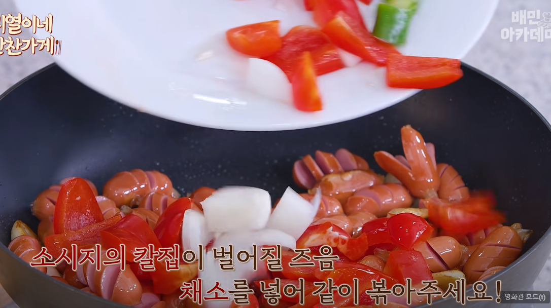 소시지의 칼집이 벌어질 즈음 손질한 야채를 모두 넣어 같이 볶아줍니다.