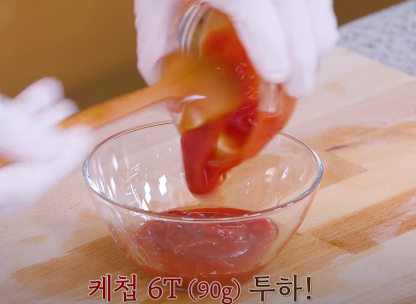 오늘의 핵심 양념을 만드는 법 알려드릴게요, 케첩 6큰술과 고추장 1큰술, 고운 고춧가루 2큰술을 넣어주세요.
