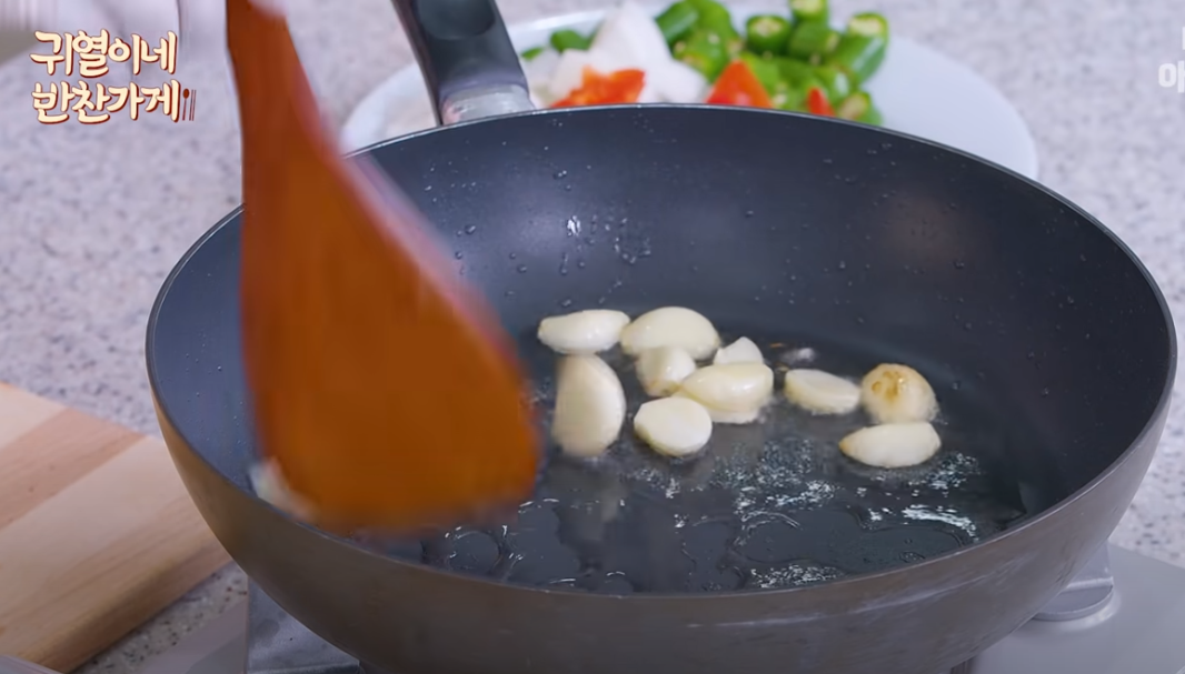피망도 큼직하게 썰어주시고 통마늘은 반을 잘라 넣어주세요, 다진 마늘도 괜찮아요.