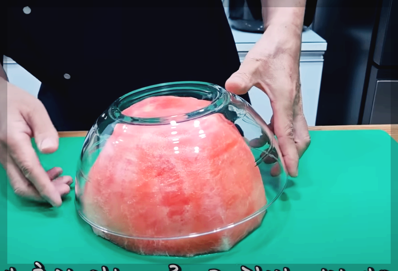 수박 크기에 맞는 용기를 준비해 주고 용기 사이즈에 맞게 맞춘 후 먹기 좋은 크기로