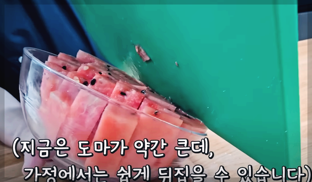 수박 담을 용기를 엎어 도마를 뒤집어줍니다. 이렇게 썰어 포크로 하나씩 빼 드시면 정말 편하답니다.