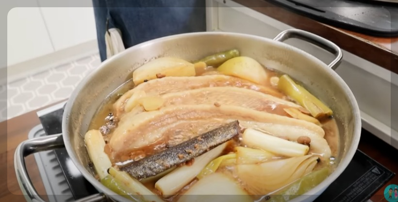 돼지고기 삼겹살의 핏물을 제거해 주고 돼지고기 껍질을 윗면으로 놓고 지방이 위로 올라오게 놓고 삶으면 껍질도