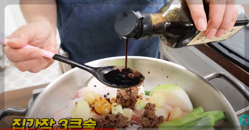 고기를 부드럽게 삶아주며 잡내도 없애주는 역활을 해줍니다. 여기에 오늘의 포인트 집간장인데요. 수육의 색을