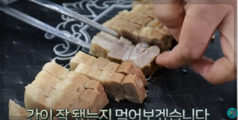 잘 삶아진 돼지고기 수육은 껍질이 탱글탱글 살아 있습니다. 잘삶아진 삼겹살 수육을 먹기 좋게 썰어줍니다.