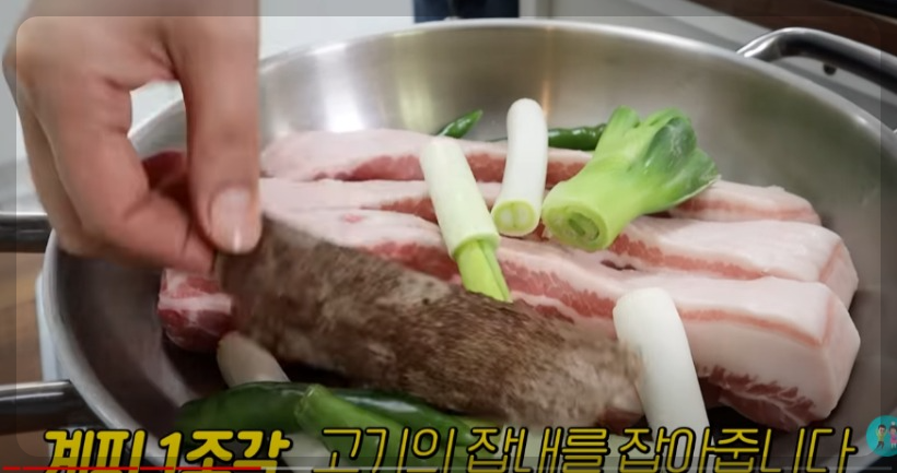 준비 재료: 통삼겹살 1kg, 대파 2대,양파 1개,계피 한조각,생강 3조각,통마늘 10알,청양고추 4개 ,통후추 반큰 술