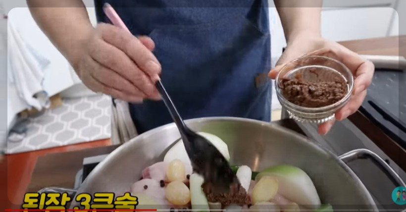 통후추를 넣어준 후 집된장 3큰술을 넣어주세요. 된장은 말하지 않아도 어떤 역할을 하는지 모두 아시잖아요.