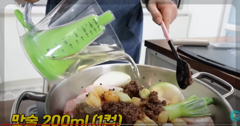 진간장, 양조간장은 안된다는 거 기억해 주세요. 맛술 200ml 한 컵과 물 1리터를 준비하시고 고기가 잠기지 않을 정도로